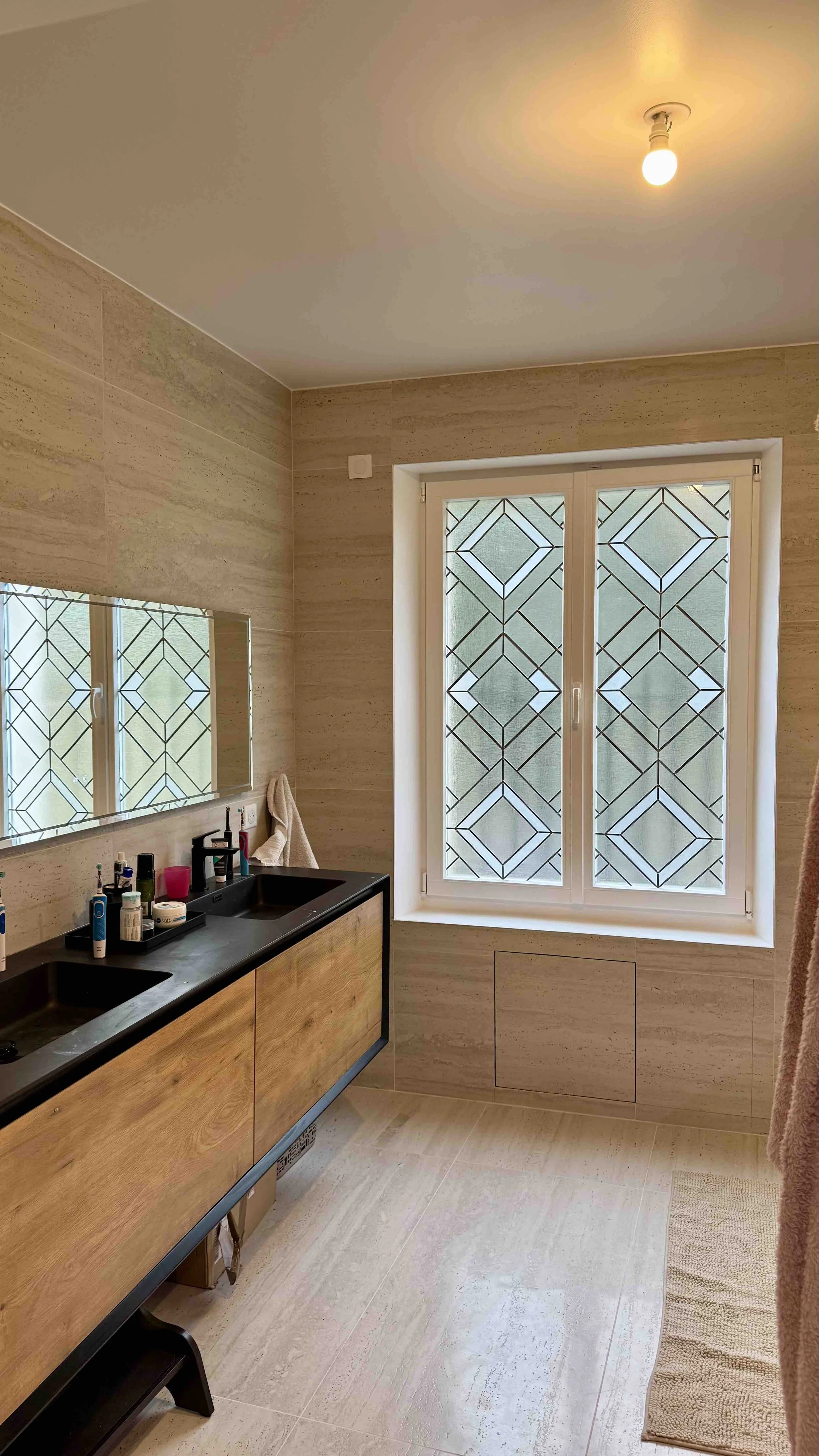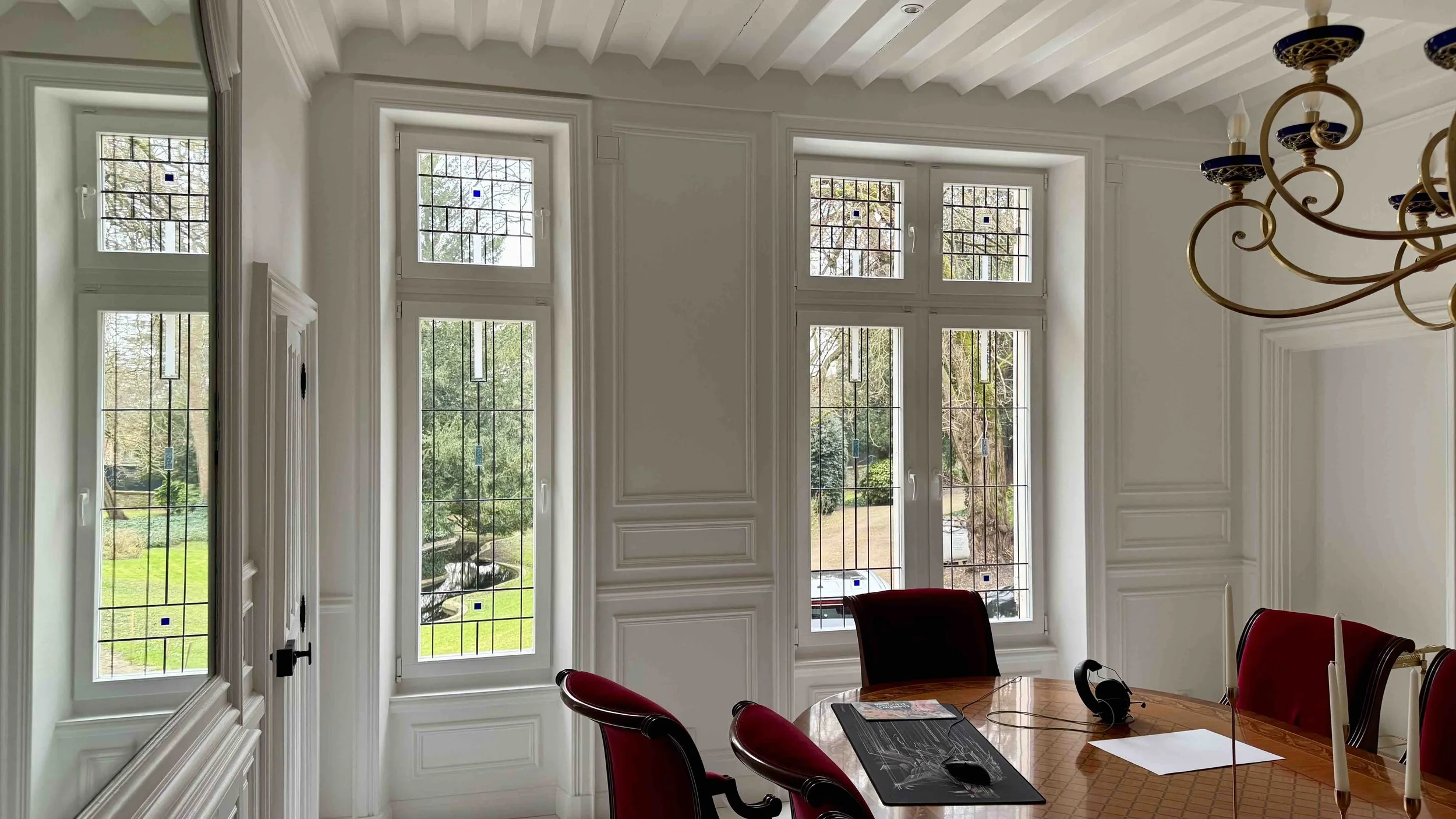 À l’origine, cette demeure était pourvue de vitraux, et les Bâtiments de France ont demandé de préserver ce caractère historique. Les menuiseries ont donc été remplacées, tout en intégrant du double vitrage isolant, répondant aux exigences contemporaines.